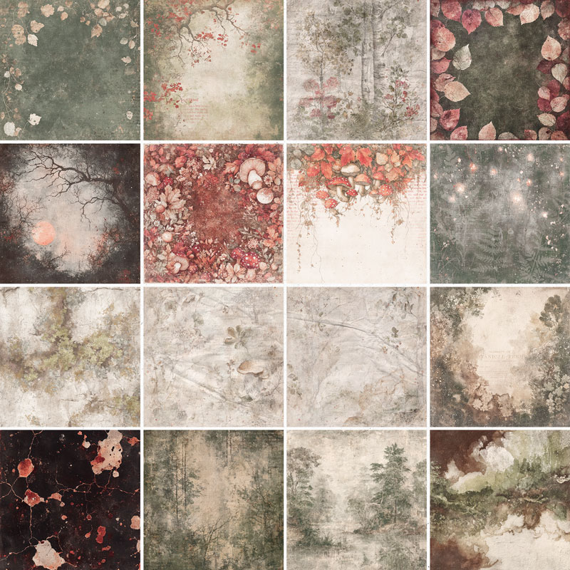 The collection includes dark canopy papers, foraged-style backgrounds, earthy solids, mixed media textures, woodland fragments, stitched details, mushrooms, branches and journal cards. Everything is designed with a grounded, natural atmosphere in mind — rich enough for dramatic pages, soft enough for everyday moments, and flexible across a wide range of autumn and woodland themes. Skogstid works especially well for documenting forest walks and colder days, seasonal journals, moody autumn pages or any project that calls for depth, texture and that quiet, slightly mysterious woodland character.