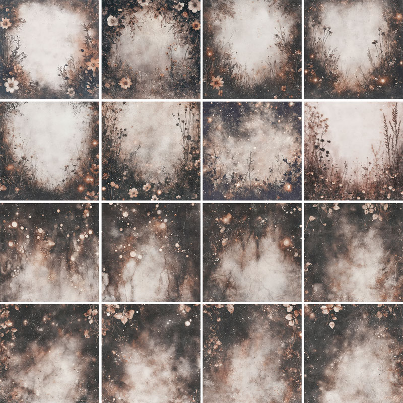 This collection gathers six coordinated packs that live in that twilight mood: enchanted cottages, atmospheric nightscapes, softly faded dusk papers, moody storybook scenes, woodland portraits of witches performing their rituals, and a set of sweet storybook elements to bring whimsy into the mix. Everything shares a palette of coppery brown, dusky rose, sepia, and muted blue-grey — tones that echo the fading light and gentle warmth of dusk.