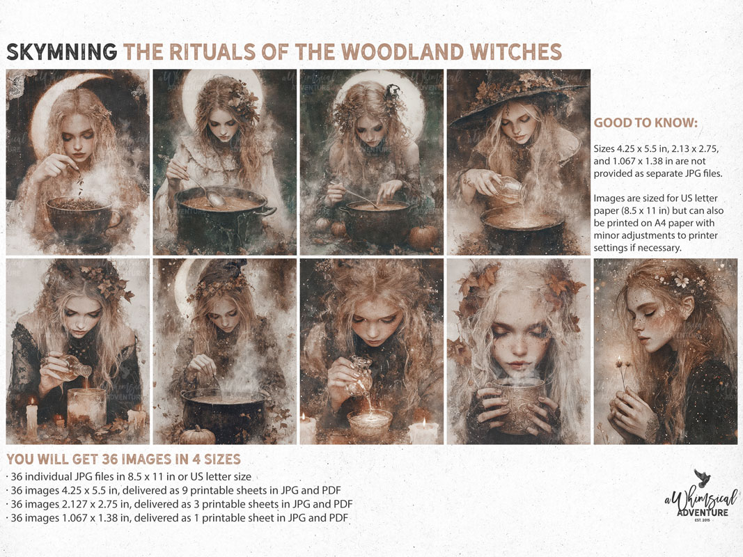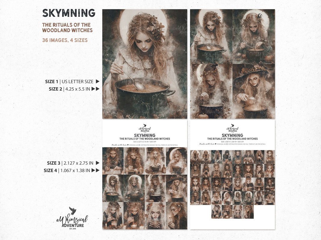 This collection gathers six coordinated packs that live in that twilight mood: enchanted cottages, atmospheric nightscapes, softly faded dusk papers, moody storybook scenes, woodland portraits of witches performing their rituals, and a set of sweet storybook elements to bring whimsy into the mix. Everything shares a palette of coppery brown, dusky rose, sepia, and muted blue-grey — tones that echo the fading light and gentle warmth of dusk.