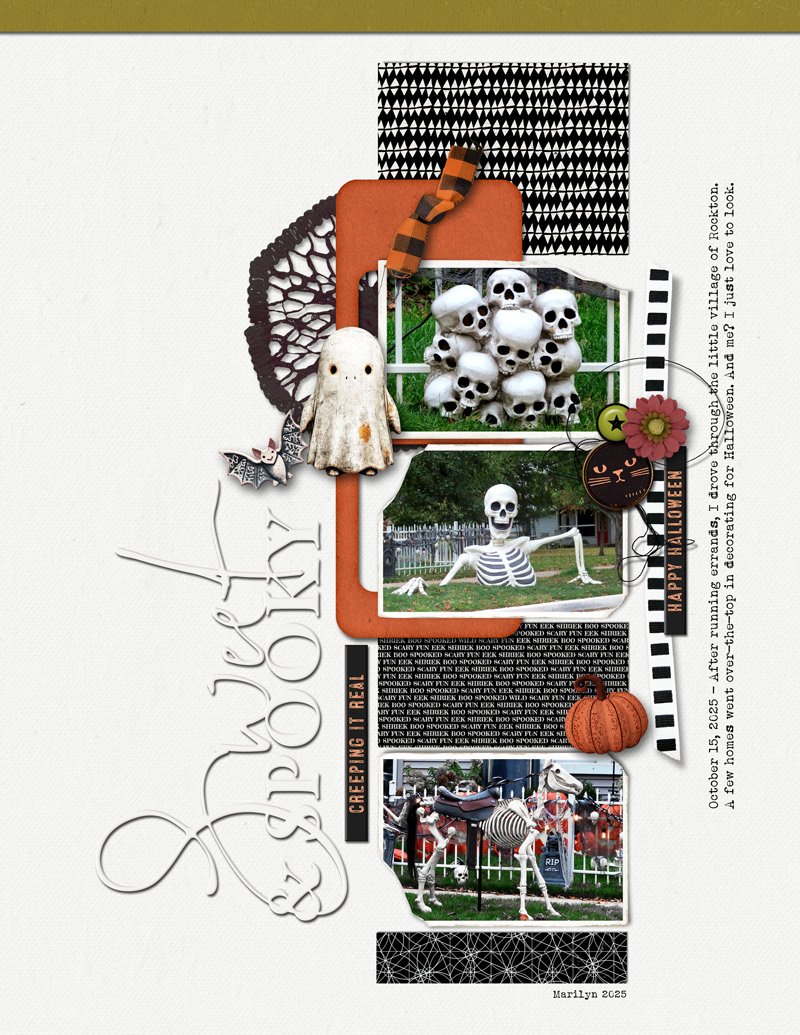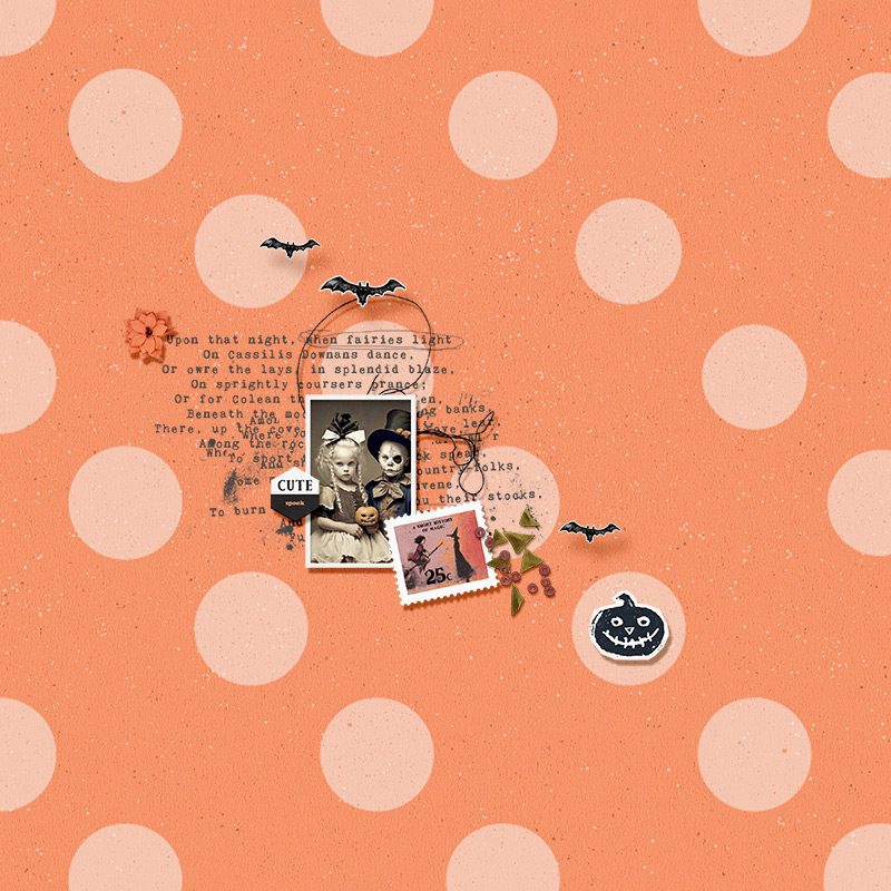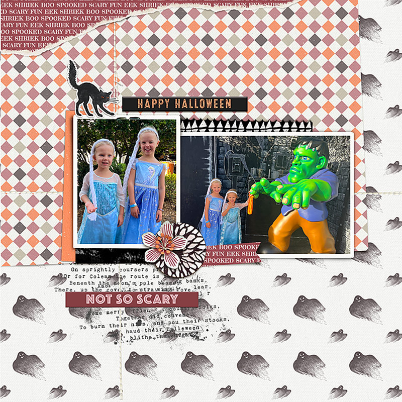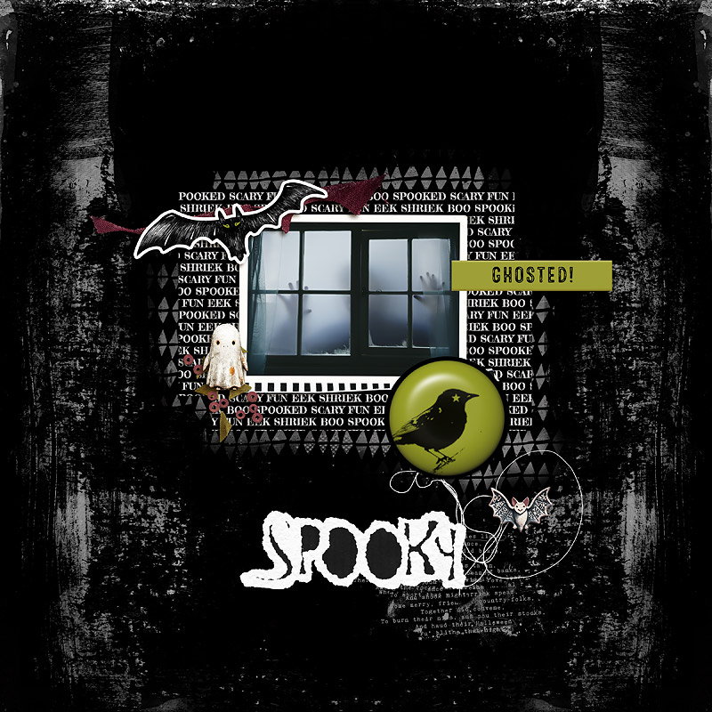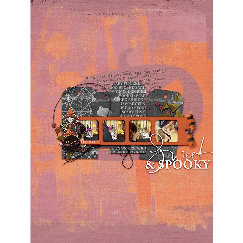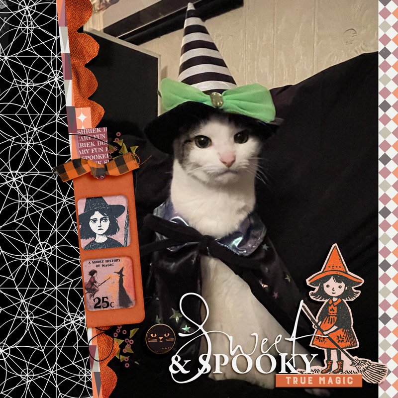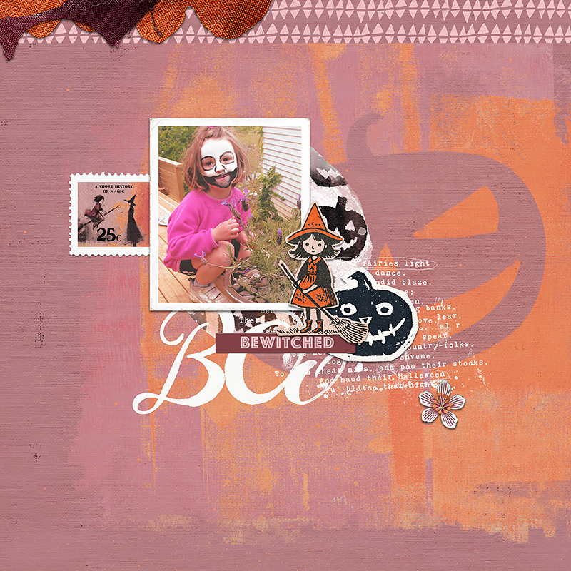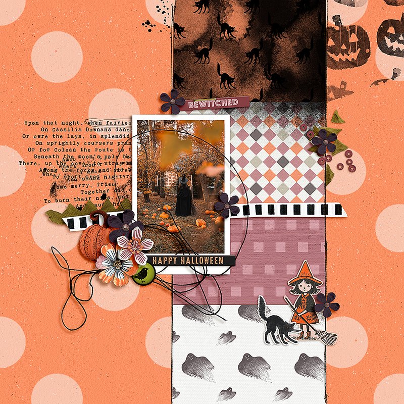 a collection of elements including titles, paint, flowers, phrase elements, postage stamps, ribbon, text fragment, thread, witch, ghost, monster, cat and bat stickers, fabric pieces, wordart.