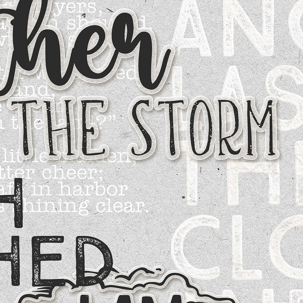 Tempest: Art Journal Wordsis a personal use element pack that features 15 unique word arts in 3 different styles for a total of 45 finished word art pngs. Each of the 15 phrases comes in a black ink, white gesso, and vellum sticker style, ready to use in your digital art.