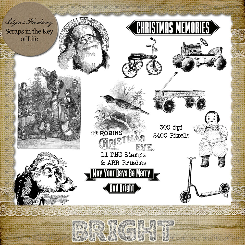 The BRIGHT Part of Merry and Bright Was Designed to Co-Ordinate With Oscraps Designer's 12 Days of Christmas Collaboration! And, of Course, My MERRY Kit! Lots of Sparkle and Vintage Appeal! Included: 2 Delightful CANDY STRIPE Alphas - Upper Case, Lower Case, Numbers and Some Punctuation 9 Bright and Cheerful Papers With 3 Additional Color Variations 11 Charming PNG Stamps - ABR Brush Files Included ELEMENTS: 7 Different Delicate Laces 2 Lace Doilies 3 Glitter Swirls/Swooshes 1 Starry Glitter Overlay 2 Wood Frames 6 Different Ribbons 2 Metal Frames 2 Bows 1 String of Pearls 2 Strings of Beads 1 Present 3 Glitter Snowflakes 1 Paper Snowflake 1 Tinsel Star Frame 1 Tinsel Tree 1 Glittery Tree Border 1 Red Stitches 2 Lace Frames 1 String Frame 1 Tag 1 Book Half 2 Glitter Frames 3 Different Candy Stripe Frames 1 Fabric Flower 4 Different Pretty Textured Mats 1 Gem 1 Ribbon Frame 1 Word Art 1 Berry Branch 4 Vintage Cards Thank You For Looking! Wishing You and Your Family All the Brightest Blessings of the Season! May Your Days Truly Be MERRY & BRIGHT Hugs From Idgie