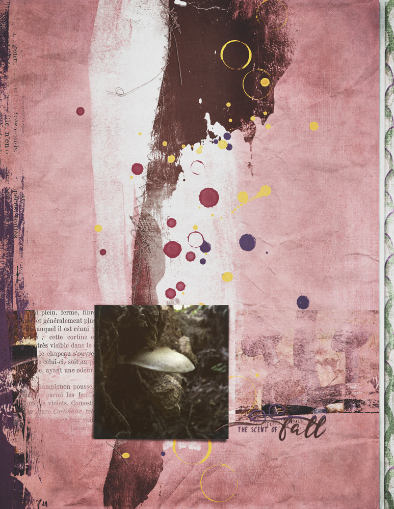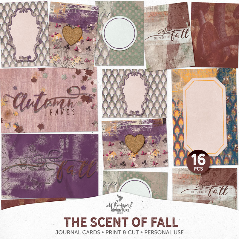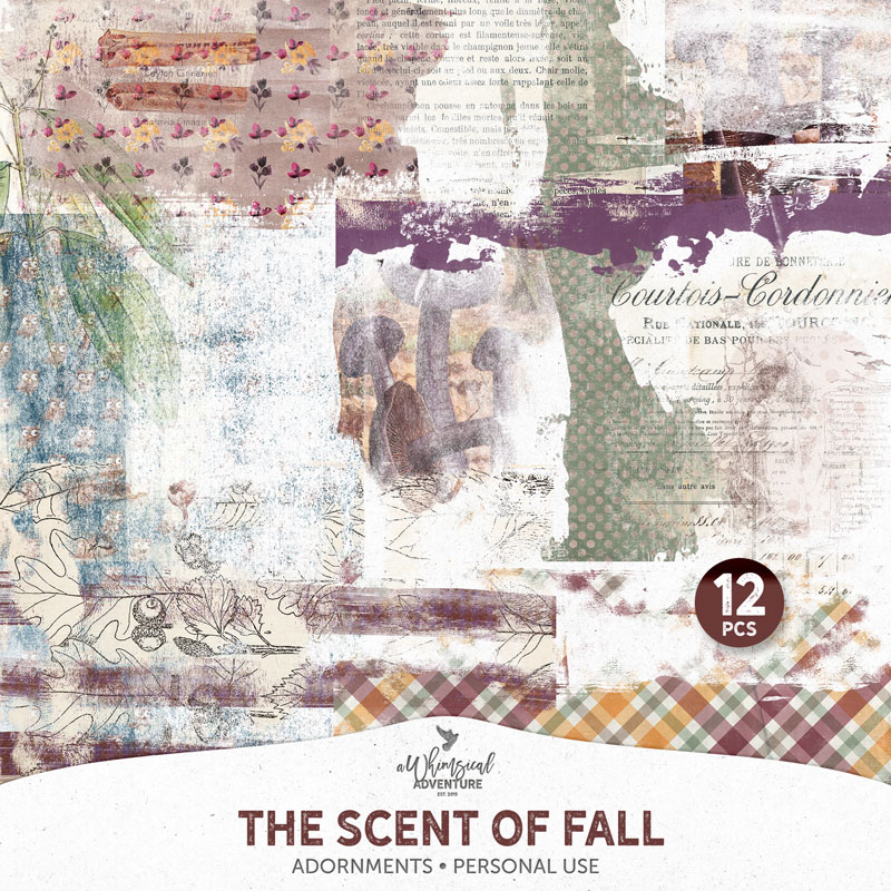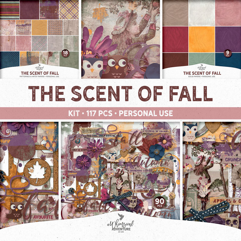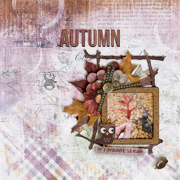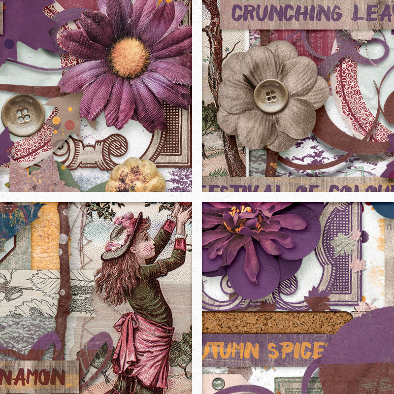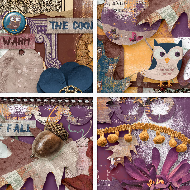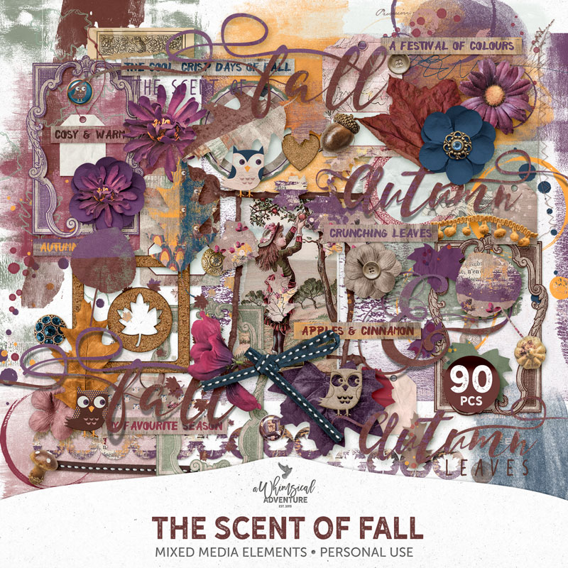 Mixed Media Elements: 90 individual PNG files, including 1 acorn, 1 circles border with cut out leaves, 3 brads, 3 buttons, 1 leaf confetti (in a shadowed and a shadowless version), 1 cork circle with a leaf cutout, 7 flowers, 1 branch frame + mask, 1 cork frame, 3 ornamental paper frames + mask, 1 cork heart, 1 torn piece of vintage ephemera, 2 real leaves, 1 fabric leaf, 4 paper leaves, 2 leaf scatters, 1 leaf scatter doodle, 4 painted masks, 1 wooden mini pumpkin, 1 mushroom, 3 owls, 1 painted overlay, 5 paint splats, 2 painted circles, 1 stamped circles cluster, 2 splatters, 1 torn vintage postcard, 3 ribbons, 2 stamps, 1 stitching, 2 round tags, 5 rectangular tags, 2 pieces of washi tape, 3 large pieces of word art, in a shadowed and shadowless version, 9 wordstrips, and finally, 8 blank strips to add your own words.