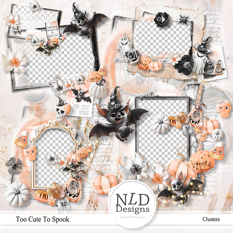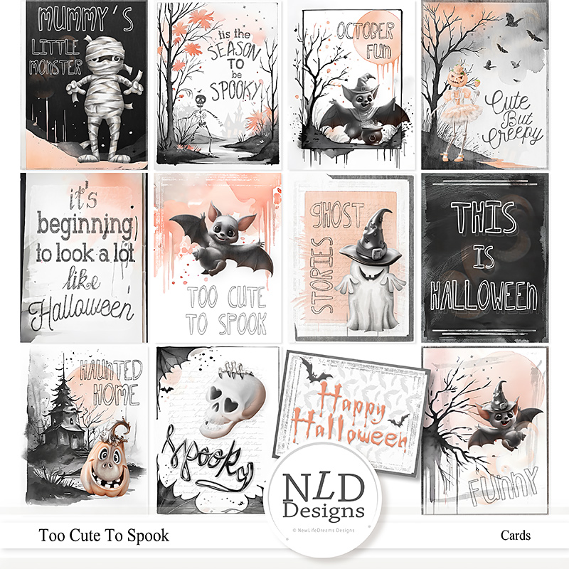 The Too Cute To Spook collection by NLD Designs includes an assortment of papers and elements to help you create halloween,autumn and funny scrapbook pages and printable art projects.