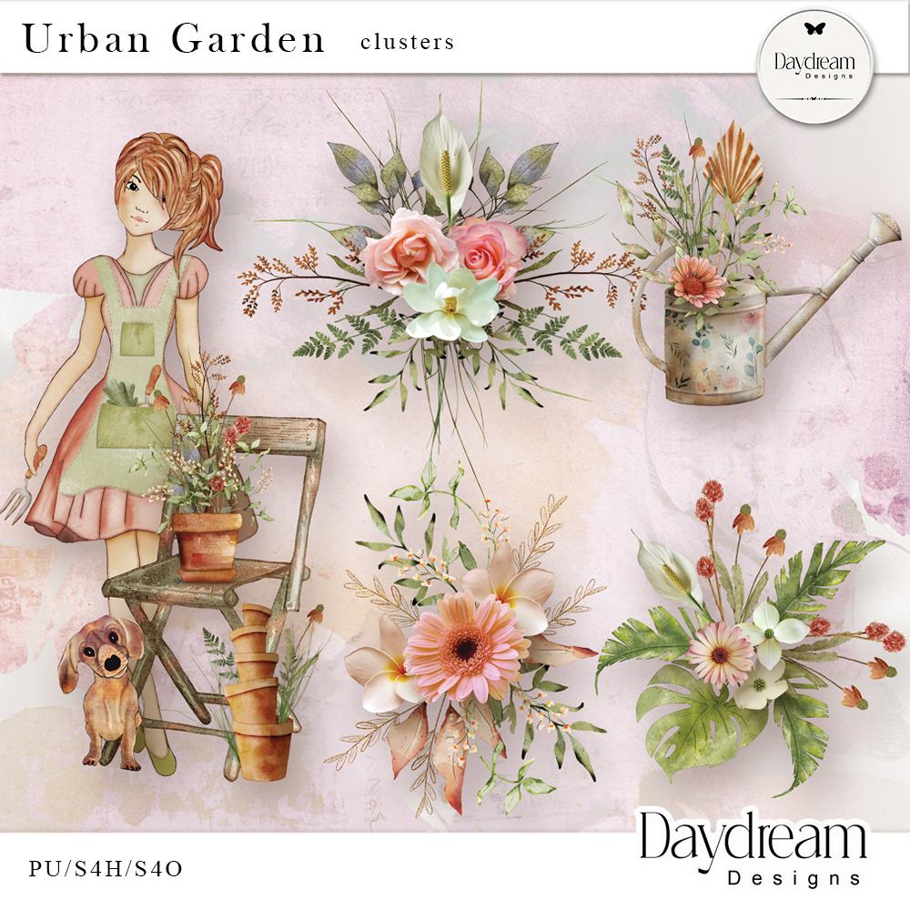 A beautiful garden-themed collection for all those who love to grow plants and flowers. Whether in a small yard, a rooftop, a balcony or just a window box, gardening connects us to nature and raises our spirits. This collection contains beautiful foliage and flowers, garden-themed elements, coordinating papers, clusters, and WordArt.