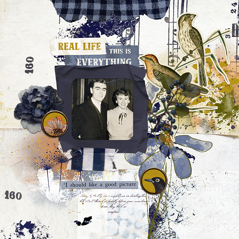 - a collection of elements including vintage birds, circle tags, gingham fabric banners, threads, flowers, postage, tapes, frame, title, bow, butterflies, ribbons, berries, leaves, tickets, assorted phase tags.