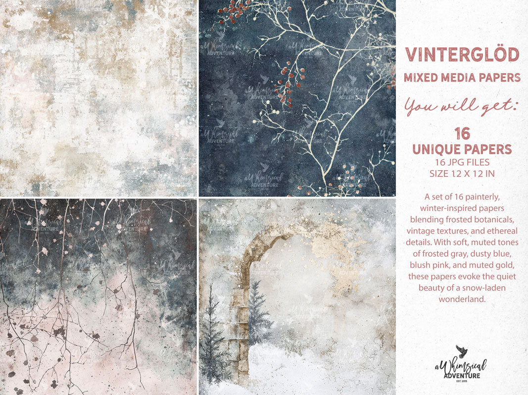 (*) 135 individual PNG files, including 1 acorn, 1 banner, 2 Christmas baubles, 1 bead scatter, 1 large bell, 2 small bells, 2 berry branches, 1 bird, 1 book cover, 3 bows, 1 boy with dog, 2 brads, 3 branches, 3 buttons, 1 candle, 1 deer, 5 pieces of paper ephemera, 1 vintage postcard, 1 fabric piece, 1 fairy on a white wolf, 1 fairy on a white owl, 13 flowers, 1 fox, 1 gold frame (2 versions), 1 silver frame and 1 frame cluster, 5 glitter splats, 1 wooden heart, 1 holly with berries, 1 house hanger, 1 ice crystal, 3 pieces of lace, 1 frosted lantern with berries, 4 leaves, 1 piece of millinery, 1 pair of mittens, 1 mushroom, 1 nutcracker figurine, 4 paint splats, 1 pear, 2 pendants, 1 shabby winter photo, 1 pinecone, 2 postage stamps, 1 ribbon, 1 scribble, 1 signpost, 1 sled, 3 snow splats, 1 'arctic' stamp, 1 wooden star, 4 stitchings, 4 tags, 1 piece of tape, 1 thread, 5 artsy flower transfers, 1 set of twigs with string, 1 pocket watch, 2 wax seals, 1 woodslice, 4 pieces of jewelry-inspired word art, 11 artsy phrases, 6 word strips (including 1 alternative), 1 wreath.