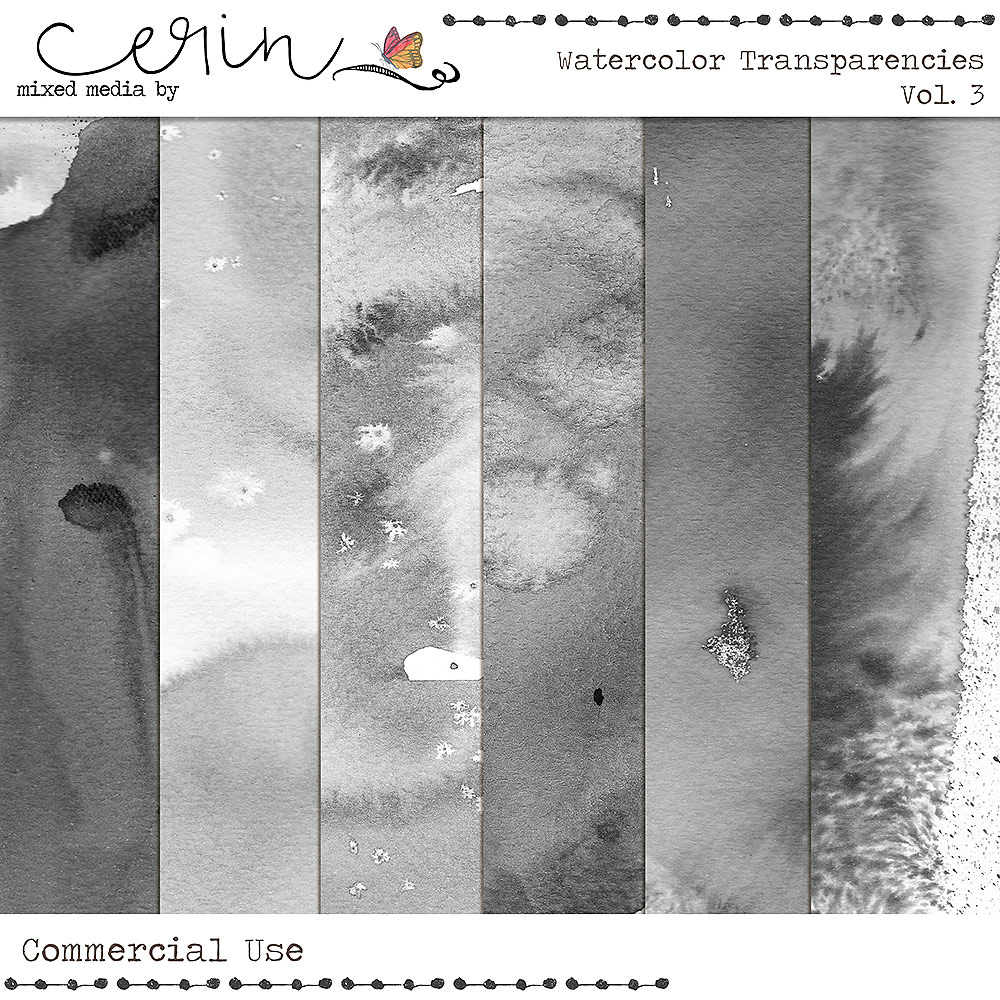 Watercolor Transparencies Vol. 3 is a commercial use transparent overlay pack that features hand painted watercolor papers that have been scanned and extracted for digital use.
