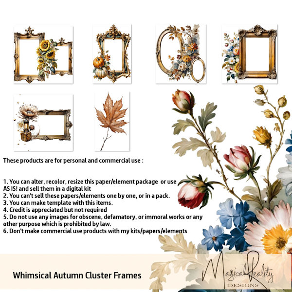 This licence is for artists, photographers, or graphic designers who want to use these graphics to create or enhance their artistic projects that they may be selling and/or using for promotional purposes. There are no restrictions on what you may or may not do with the items in this product as long as you are embedding it into your project and not trying to resell or share it as a resource, or in another digital kit. You may NOT resell any item as is. Recoloring does not constitute a change. They must be altered or blended into other things to be considered changed.