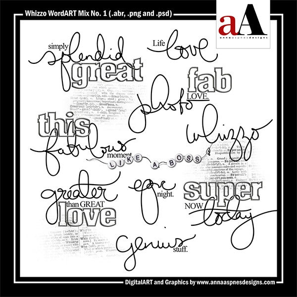 A collection of 18 varied WordART elements relating to awesome/top-notch/fabulous, to include 5 MetalWords, 9 WordART quotes/titles, 3 WordTransfers one BeadedThreadz designed to be mixed and matched to create custom WordART titles. I’ve also included the WordART and WordTransfer designs in brush .abr format. Add a drop shadow layer style to MetalWord elements for best results. Guidance on the use of my designs in Photoshop and Elements can be found in the Instructions for Use eBooklet which is available as a free download from the store and in the videos on the aA Youtube channel.