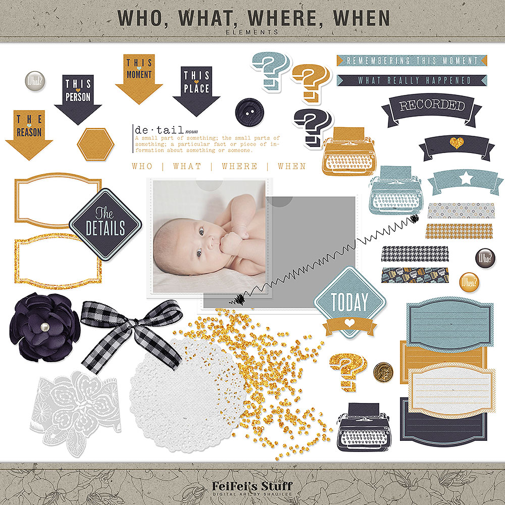 Included in the Who What Where When Digital Scrapbook Kit by FeiFei Stuff