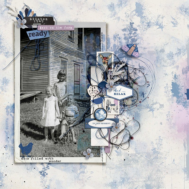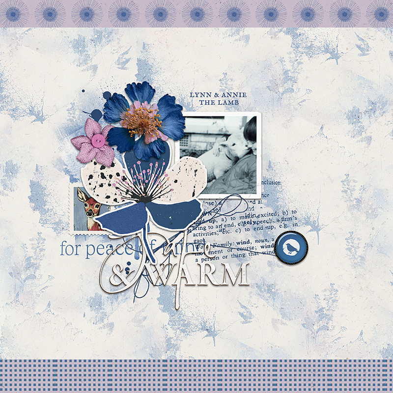 an element pack including flowers, glass buttons, painted floral and leaf elements/stickers, journaling and phrase elements, threads, postage stamps, snippets of text, titles.