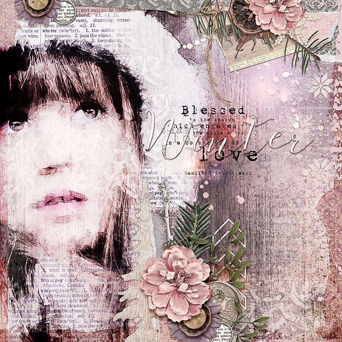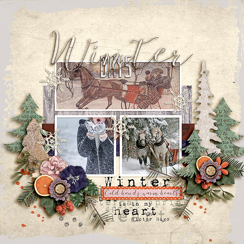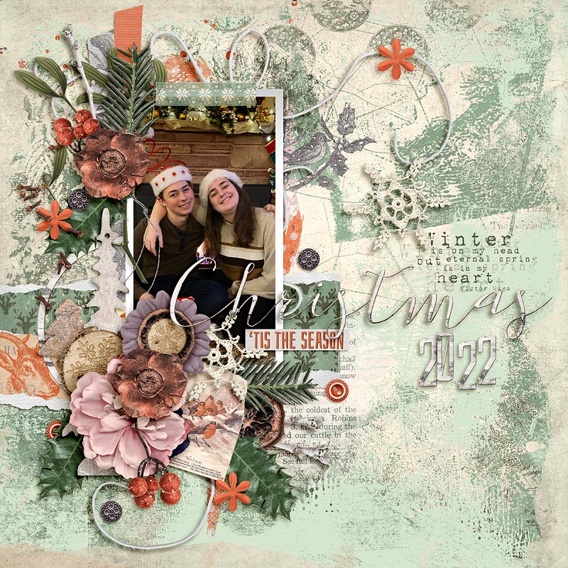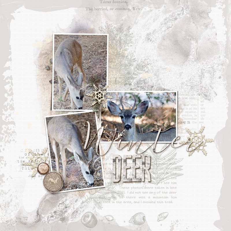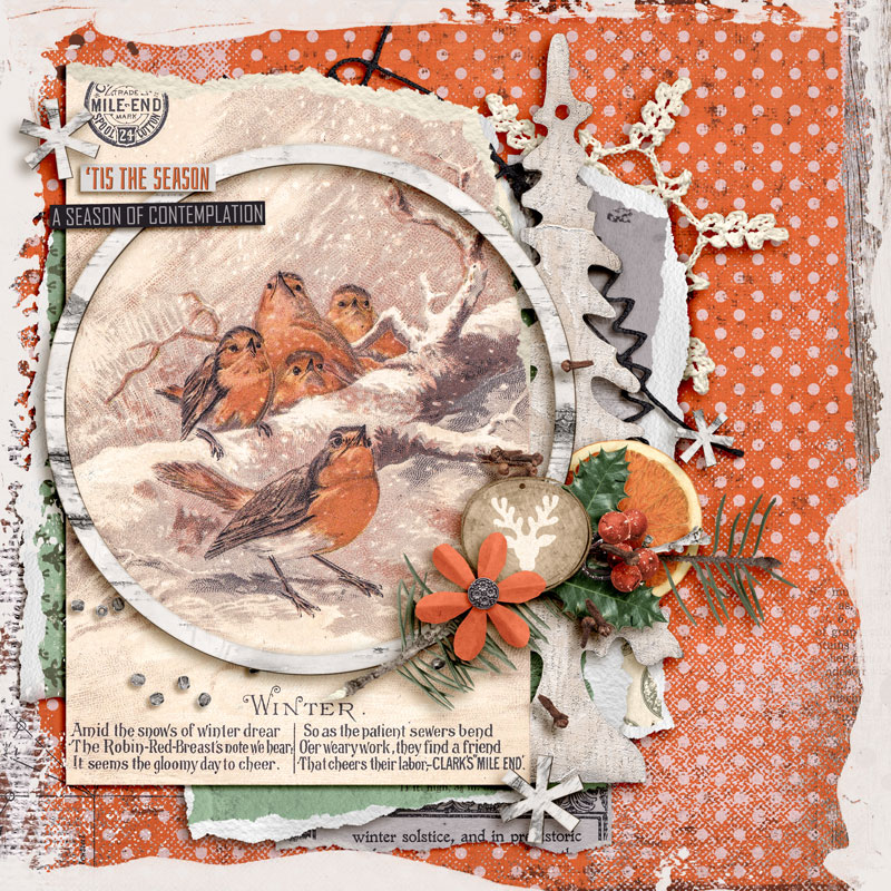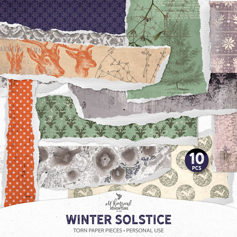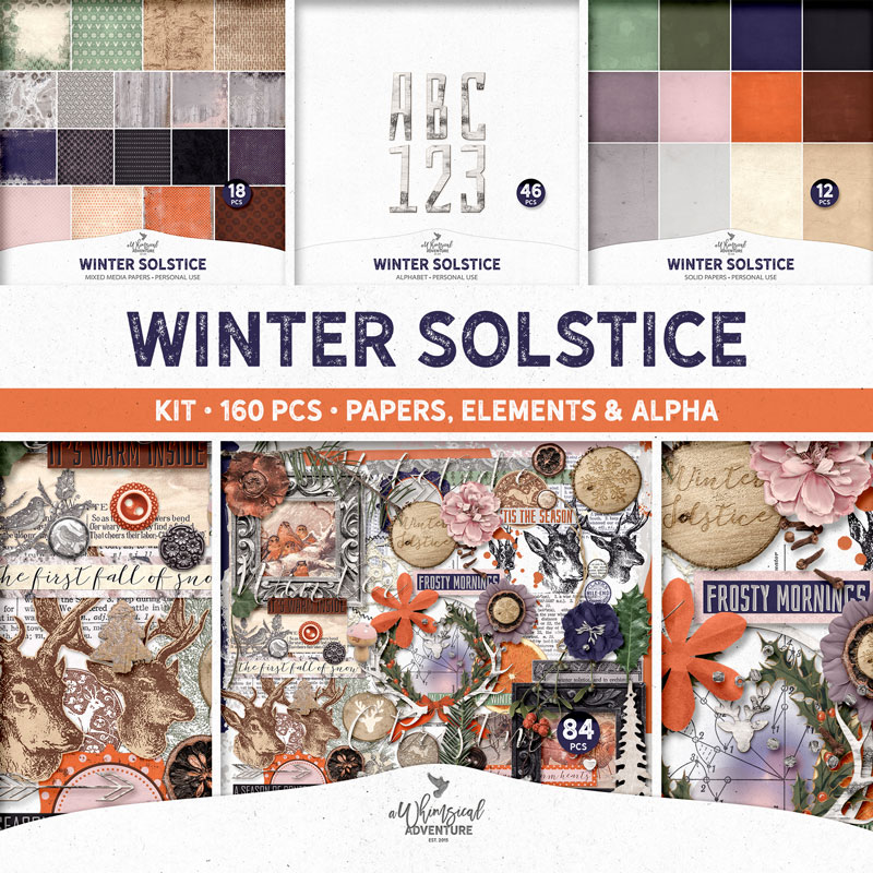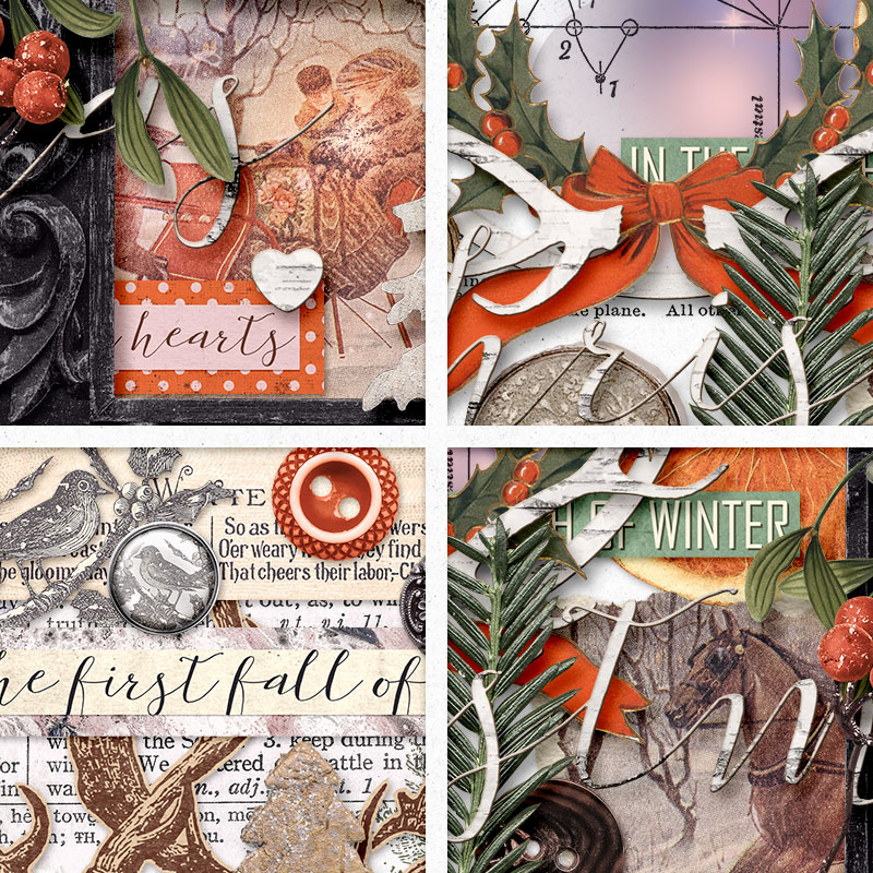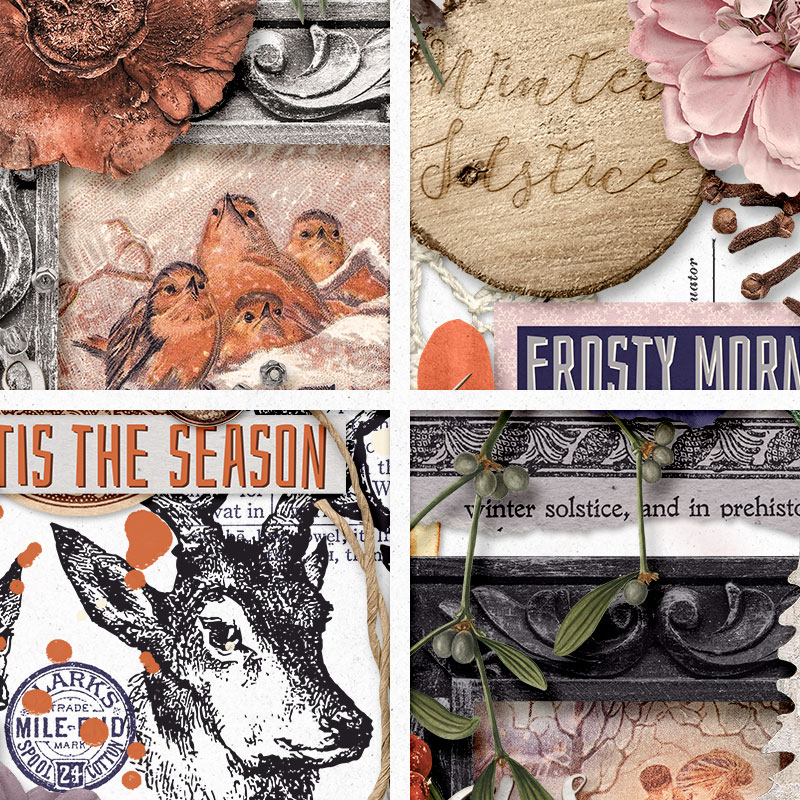 Mixed Media Elements: 84 individual PNG files, including 1 antler, 2 arrows, 1 bead scatter, 1 branch with berries, 1 winter bird sticker, 3 brads, 2 branches, 3 buttons, 1 cloves scatter, 1 vintage deer sticker, 1 birchwood deer head, 2 dried fruit slices, 1 pine cone flower, 2 fabric flowers, 1 paper flower, 1 composite flower, 2 wooden frames, 1 circular birchwood frame + mask, 1 birchwood heart, 1 vintage Christmas wreath, 1 holly leaf, 1 ivy leaf, 1 pine cone leaf, 1 vintage mistletoe, 2 lights, 1 wooden mushroom, 1 vintage orange slice image, 2 paint splatters, 3 painted edges, 1 painted paper edging, 1 glittery wooden pine tree, 1 white wood pine tree, 3 fabric ribbons, 1 crochet snowflake, 1 stitched circle, 2 strings, 1 round vintage deer tag, 1 vintage bird tag (in two versions), 2 fancy labels, 2 vintage dictionary blends, 1 torn piece of vintage ephemera, 2 winter themed torn vintage postcards, 8 vintage stamps, 2 wood slices with an engraved deer, 1 wood slice with an engraved snowflake, 1 wood slice with engraved words, 3 large birchwood words and 7 word strips.