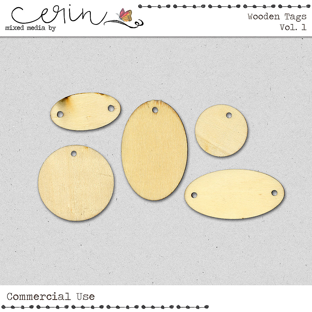 Wooden Tags Vol. 1 (CU) by Mixed Media by Erin is a commercial use element pack that features 5 wood veneer tags.
