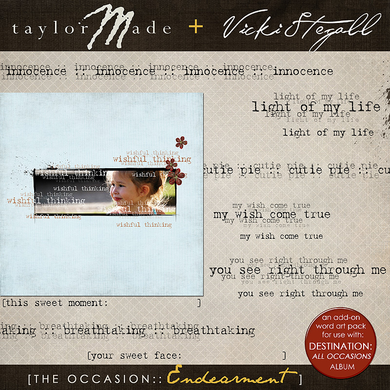 Buy together and save! Vicki and Amanda have taken all of your favorite word arts and bundled them up together for amazing savings! And they all coordinate perfectly with the Layered Template Album "[Destination: All Occasions]" by Vicki Stegall + TaylorMade Designs!