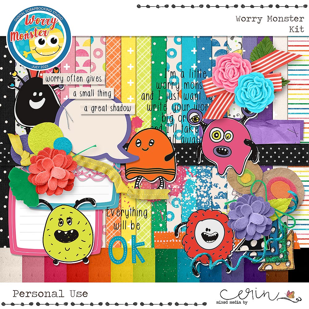Worry Monster {Kit} by Mixed Media by Erin contains 7 unique paper patterns with recolors, 14 solids & 30 unique elements