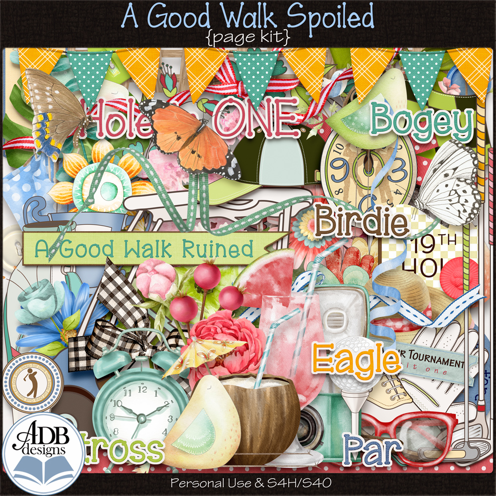 A Good Walk Spoiled by ADB Designs is a delightful collection all about springtime & golf season. This collection is full of flowers and foliage, plus all the necessary golf extras, from golf cart to sunglasses. It is perfect for scrapping your golfing family members whether they indulge in traditional golf or miniature golf. This collection is versatile and ready to help you scrap traditional springtime photos of family and friends.