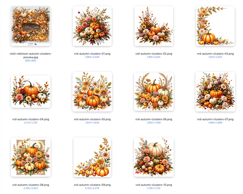 Celebrate the cozy magic of fall with Autumn Clusters — a richly detailed digital art product by Vicki Robinson. This pack makes it effortless to add instant seasonal warmth to your digital scrapbooking pages, art journaling spreads, and printable projects. Handcrafted arrangements of pumpkins, sunflowers, berries, and autumn foliage give your layouts a finished look in seconds — just drag, drop, and layer.