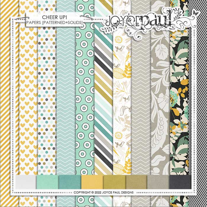 Cheer Up! is a digital scrapbooking collection by Joyce Paul Designs. This kit includes: 10 Patterned/Textured Papers 8 Solid Papers 66 Elements (48 unique) PLEASE NOTE: Some of the papers used on the sample pages may not be included in the kit! Only in the bundle.