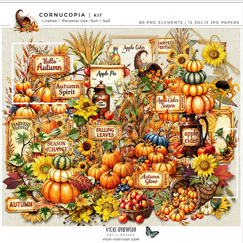 Elements (80 PNGs): 1 apple basket; 1 border; 1 bow; 2 cider jugs; 2 corn husks; 9 flowers; 4 frames; 5 harvest signs; 3 cornucopias; 3 leaf prints; 1 leaf scatter; 13 leaves; 11 pumpkins; 2 recipes; 1 seedpod; 3 staples; 3 strings; 2 tapes; 13 tickets