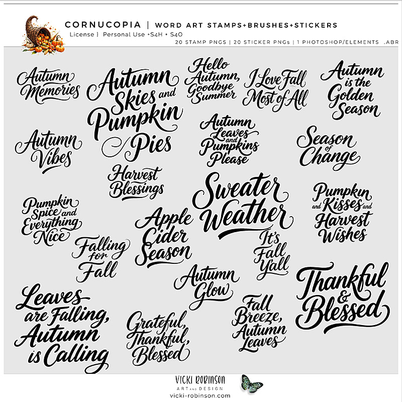 Word Art: 20 stamps, 20 stickers, and 1 Photoshop/Elements .abr brush file