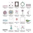 5 + 1 hand drawn doodled flowers 3 with leaves and stems, two without and 1 hand drawn doodled leaf