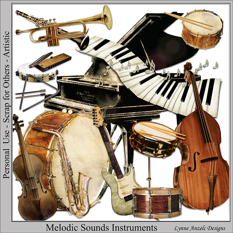 How often have your heard a sound or song that pulls you back in memory to a specific time or place? Sounds can define moments in our lives, especially music. Use this kit to revist those memories. Melodic Sounds is chock full of musical instruments, and transfers that will blend beautifully into the backgrounds (or with each other) to give you a harmonius page that will delight the senses!