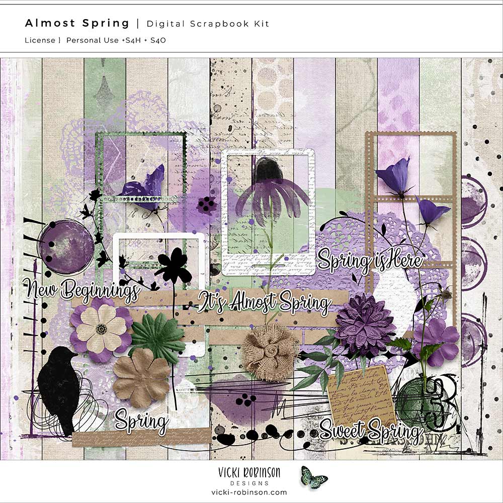 This bundle of two kits. Almost Sping and Spring Breeze are Digital Scrapbook pack by Vicki Robinson. They include a variety of elements and papers to create Spring themed scrapbook pages, digital art, and printable art projects.