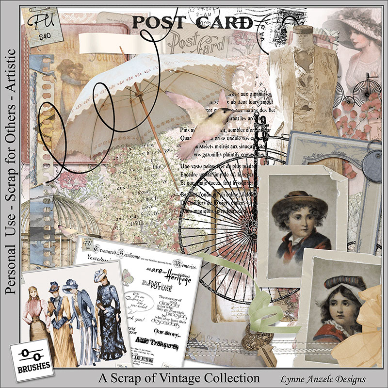 Elements include 49 + color changed elements of vintage style, including an antique parasol, an antique baby carriage, mannequin, 2 vintage portraits, a baby book, journal, 3 birds, birdcage, 2 lace, a cycle strip and a single cycle, postcard, 2 postage stamps, scroll tape, 2 swirls, 2 ribbons, bows, buttons, 3 frames, key, key on ribbon, tags, stamp, letter, sewing machine, 3 leaves, glitter rub-on, rose rub-on, vintage license, masks, 2 strips, swirl edge, yarn, and a needle. Ribbons, buttons and tags come in additional colors.