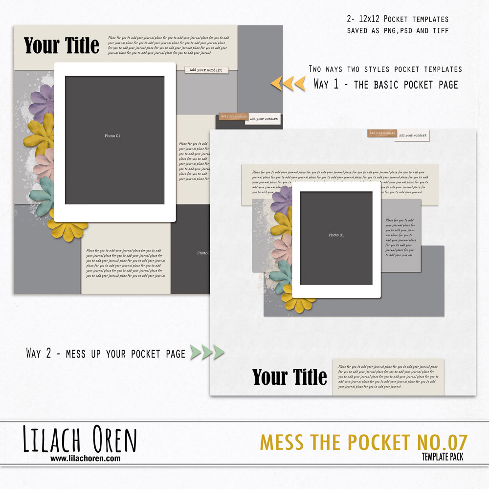 Buy the bundle and Save!! Get 8 layered template in one bundle set. Mess the pocket templates bundle pack 02 by Lilach Oren is a pack of 4 Mess the pocket templates sets. In this pack you will get eight 12x12 layered templates for you to scrap your memories and your every day life in a fast and easy way with those 4 basic pocket page templates and 4 messy layered templates.