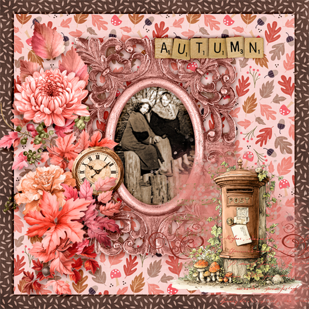 Oh, the elements! There are vintage pieces like a pair of eyeglasses, a teapot, an oil lamp, and a cast iron frying pan; wonderful fall-themed wordstrips, adorable animals, and tons of florals and foliage. The colors are wonderful: pink and cherry; coral, peach and pumpkin; olive green, coffee brown and charcoal gray.