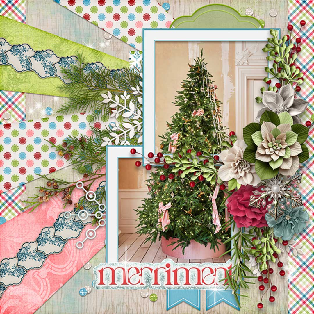 The elements are traditional and suitable for many projects you may have. There are buttons, frames, journalers, hardware, bling, ribbons, confetti, glitter papers, snowflakes, word art, and lots of flowers and foliage. The colors are so much fun: candy cane pink, Santa red, Grinch green, as well as teal, aqua and cream.