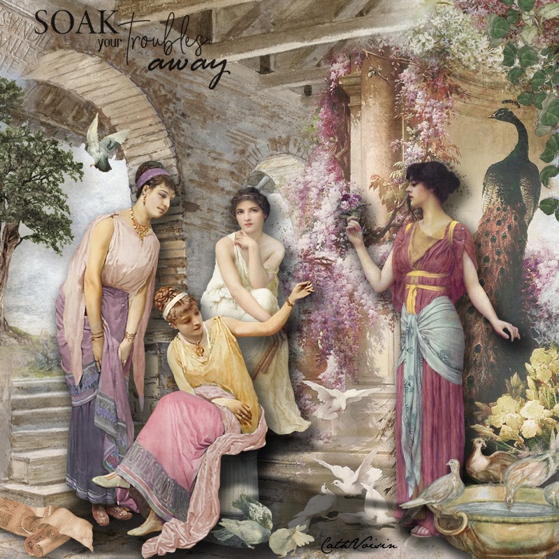 Detailed Elements: 1 Arch, 1 Bathing, 2 Baths, 1 Birdbath, 2 Birds, 6 Blends, 3 Books, 1 Candle, 1 Cloud, 1 Cobblestone, 1 Coloseum, 4 Columns, 1 Cracks, 2 Doors, 1 Doorway, 2 Drapes, 2 Floors, 1 Floral, 1 Florets, 1 Frame, 2 Frescos, 2 Gardens, 2 Globes, 1 Instrument, 2 Latin Words, 2 Males, 1 Mask, 1 Nautilus, 2 Overlays, 1 Patio, 1 Peacock, 9 Plants, 1 Poet, 1 Pond, 1 Pottery, 1 Rocks, 1 Root, 2 Scripts, 1 Scroll, 1 Sculpture, 1 Shawl, 1 Stairs, 2 Stamp Bits, 2 Strips, 3 Trees, 2 Tubs, 1 Tubspout, 1 Urn, 2 Walls, 1 Well, 1 Window, 13 Women