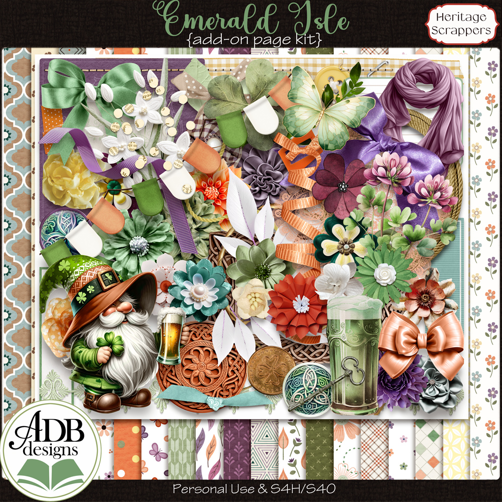 Emerald Isle Page Kit is a Digital Scrapbook Kit by ADB Designs. It includes a variety of papers and elements to create heritage-themed scrapbook pages, digital art, and printable art projects.