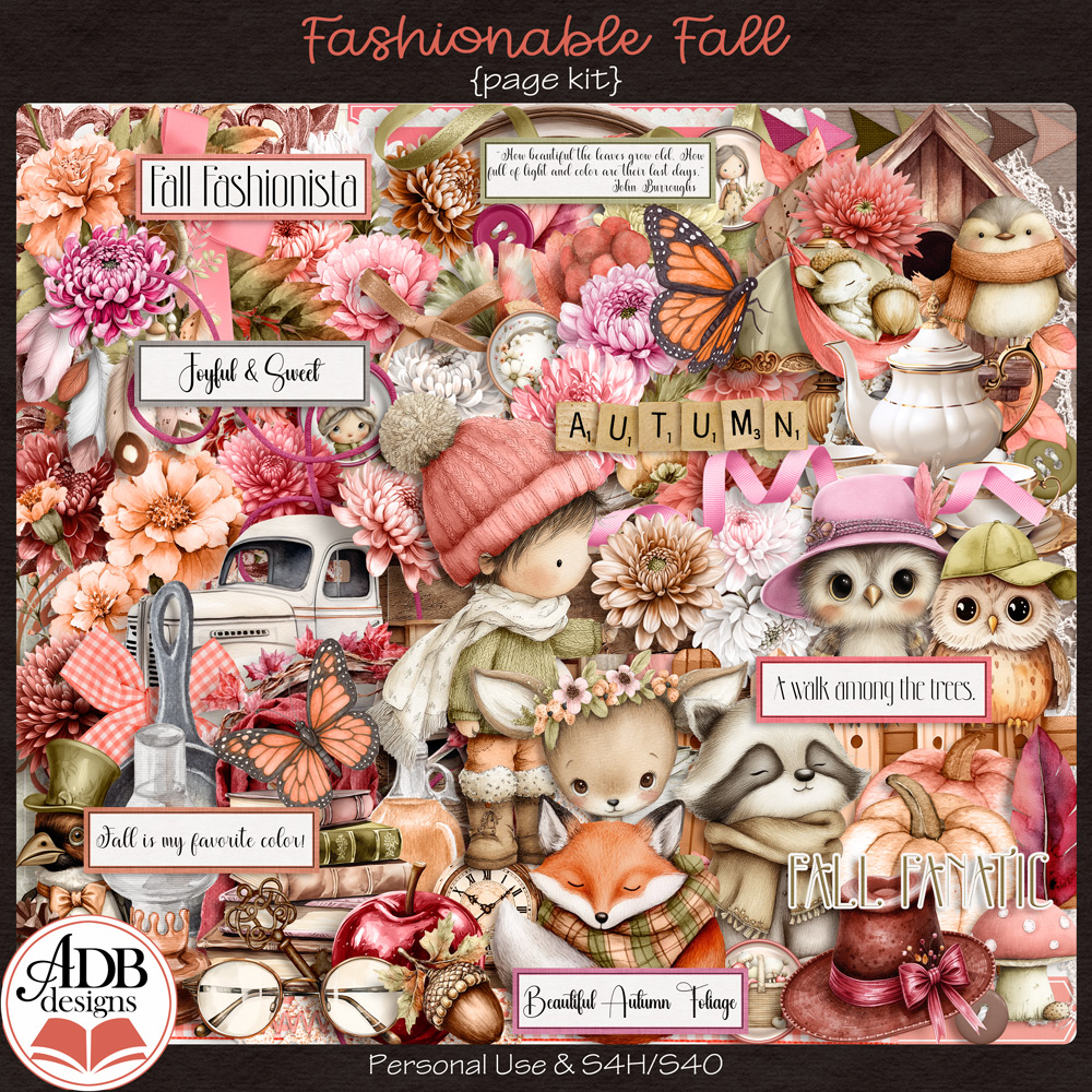 The Fashionable Fall Collection is so sweet and warm! It evokes autumn leaves, sweaters and scarves, pumpkins and fall flowers, along with fun critters and kids. Perfect for scrapping up those beautiful Autumnal days!