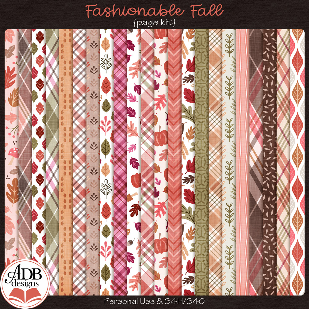Fashionable Fall Page Kit by ADB Designs is a Digital Scrapbook Pack. It includes a variety of papers and elements to create traditional-themed scrapbook pages, digital art, and printable art projects.