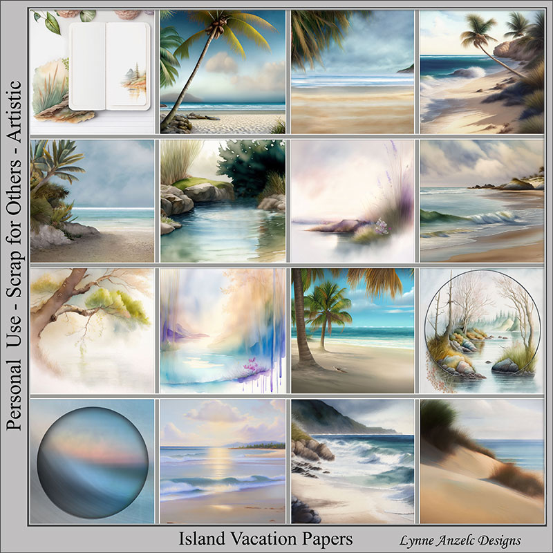 Island Vacation Papers is a Digital Scrapbook Pack by Lynne Anzelc. It includes a variety of papers to create beach-themed scrapbook pages, digital art, and printable art projects.