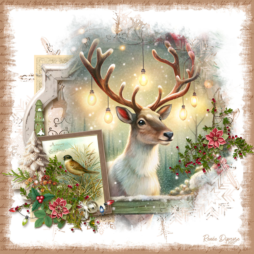 The elements are adorable: an elf, Santa, reindeer, dove, an old-time radio, bells, a candle; and ribbons, foliage and flowers are plentiful. The color palette features the traditional Christmas colors of red and greens, along with some white and blue.