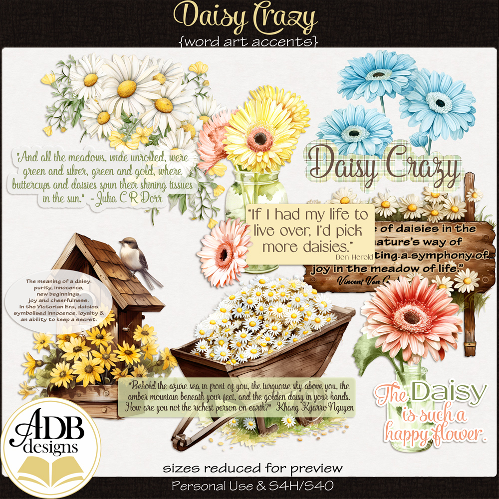 Daisy Crazy Word Art is a Digital Scrapbook Pack by ADB Designs. It includes a variety of to create vintage-themed scrapbook pages, digital art, and printable art projects.