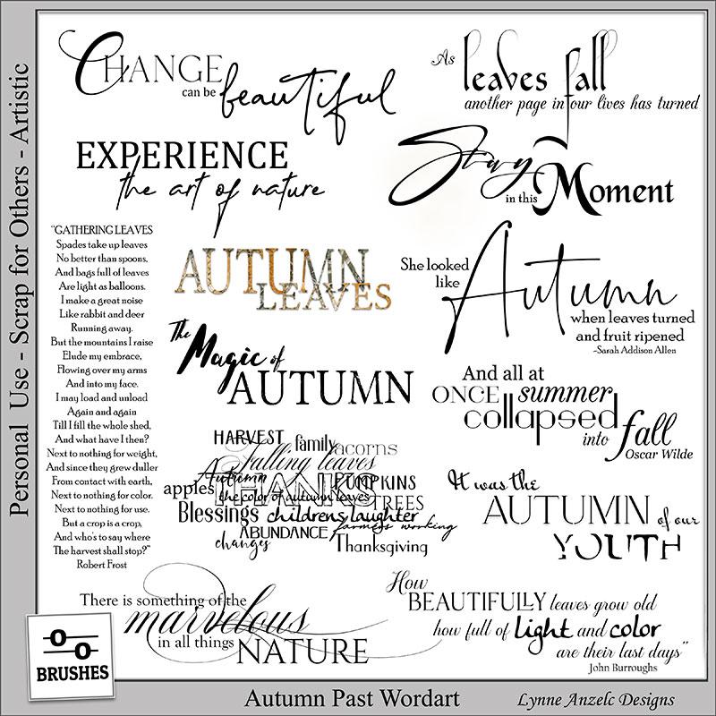 Autumn Past Wordart and Brushes is a Digital Scrapbook Pack by Lynne Anzelc. It includes a variety of elements to create autumn-themed scrapbook pages, digital art, and printable art projects.