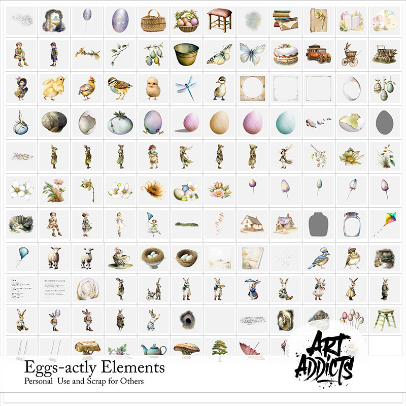 Eggsactly Kit is a Digital Scrapbook Kit by Art Addicts. It includes various elements and papers to create Easter-themed scrapbook pages, digital art, and printable art projects.