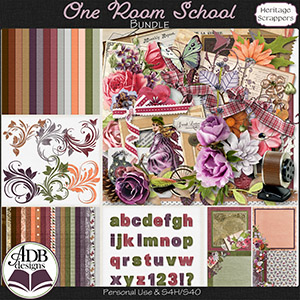 Discover the One Room School Digital Scrapbook Collection, a heritage collection that transports us back to the days of one-room schoolhouses, teacher's pets and picnic lunches. While One Room School captures the essence of old-time small-town America, it works for modern day equally well - whether school-related or not. With its fall color palette, florals, vintage ephemera, buttons and bows, it's perfect for any project.