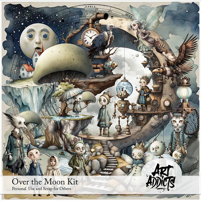 Over the Moon Kit is a Digital Scrapbook Kit by Art Addicts. It includes various elements and papers to create outer space-themed scrapbook pages, digital art, and printable art projects. Note: Individual downloads include CA Pack zips