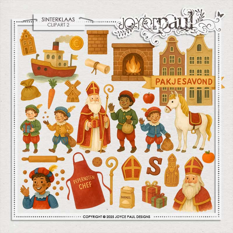 This clipart set is filled with charming Sinterklaas illustrations that coordinate perfectly with the rest of the collection. The set includes iconic Dutch holiday imagery such as Sinterklaas, Pieten, Pakjesboot 12, gifts, houses, chimney scenes, festive treats, and more.