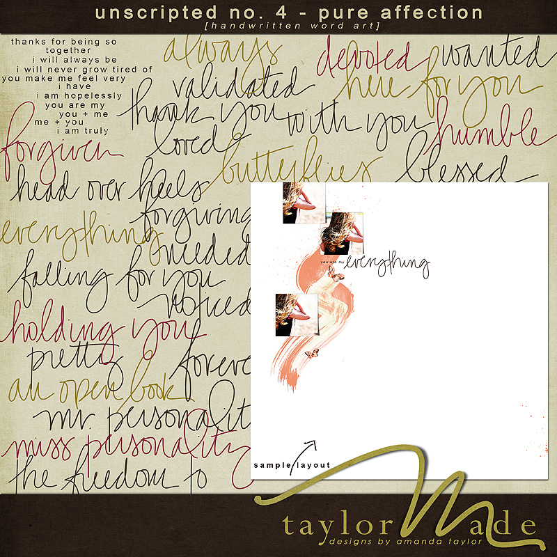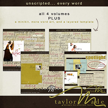 Includes ALL 4 volumes of Unscripted Word art, plus a mini kit, more word art, and a layered template.