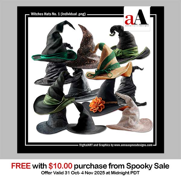 A collection of 12 witch hat embellishments delivered in .png format for Halloween-themed digital scrapbooking, crafts, and art journaling.